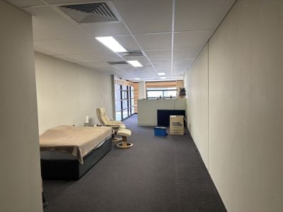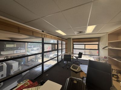 - Mezzanine office with ducted AC, large windows, and carpet